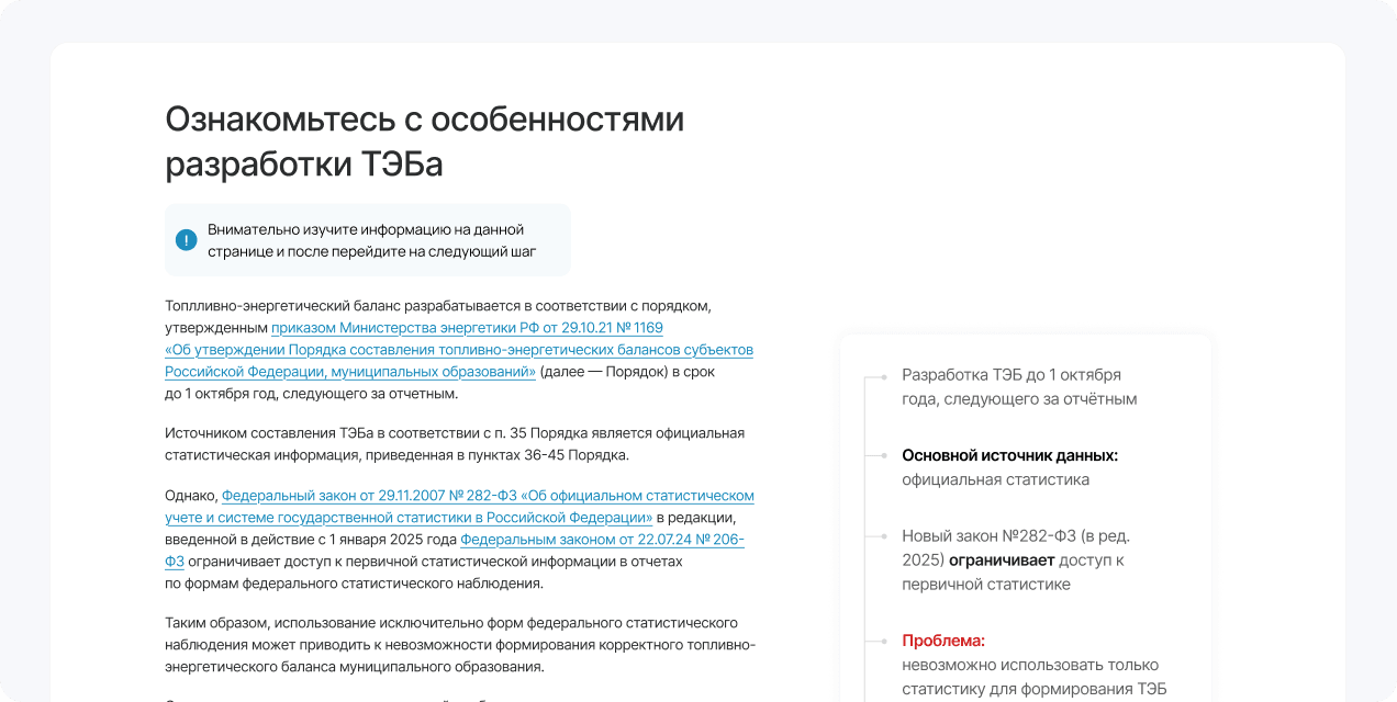 При запуске сервиса перед командой стояла задача сократить время подготовки топливно-энергетического баланса до одного дня при наличии исходных данных, сделать инструмент полностью бесплатным и открытым без регистрации, упростить сбор информации за счёт удобной загрузки данных и шаблонов запросов для внешних организаций, а также обеспечить полное соответствие итогового баланса требованиям Федерального закона № 190-ФЗ «О теплоснабжении» и приказа Минэнерго России № 1169.